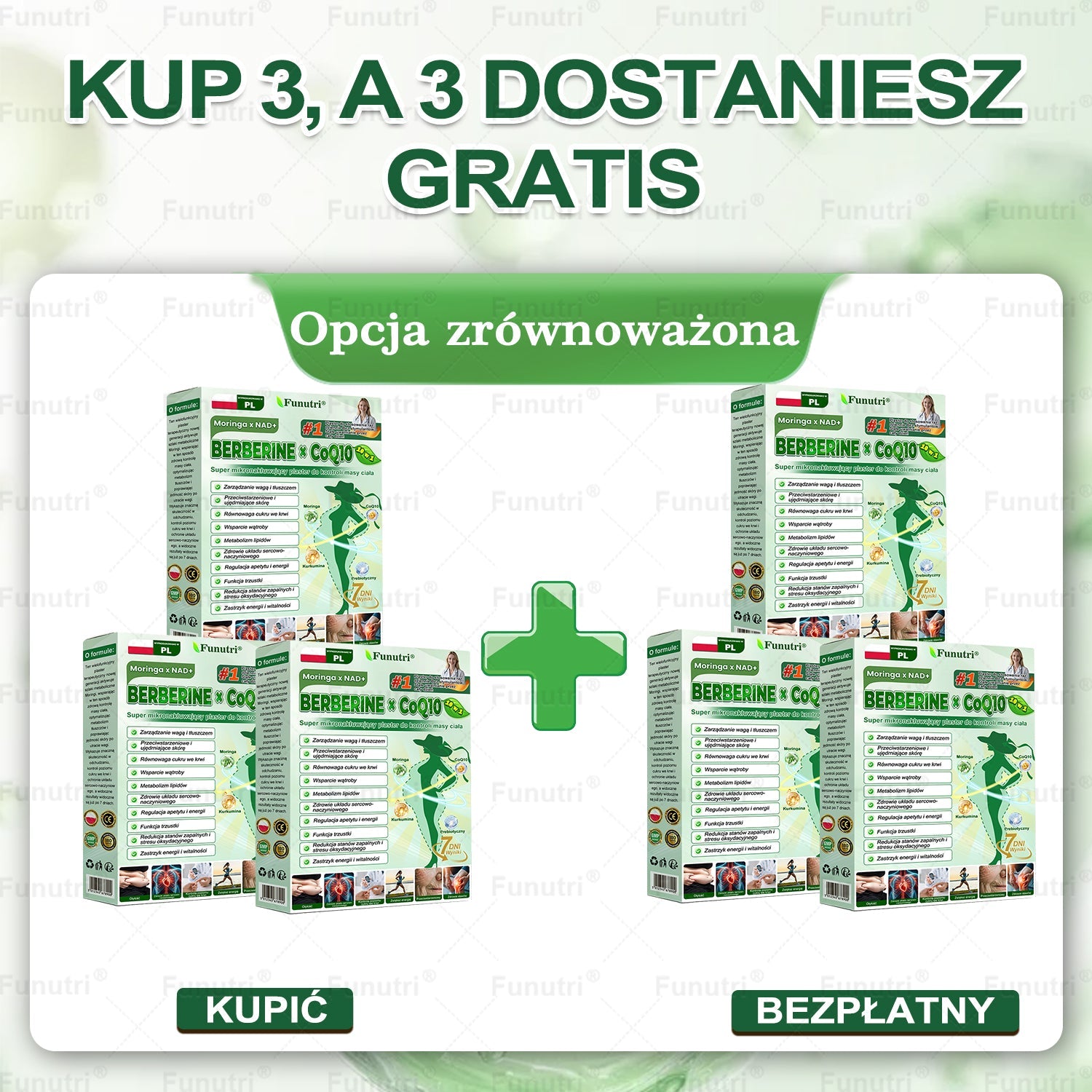 Funutri® Moringa × NAD+ × Berberyna × CoQ10 – Super Plaster Mikronakłuwający został opracowany na podstawie 20+ lat badań oraz doświadczenia ponad 30 specjalistów i jest przeznaczony dla wszystkich dorosłych oraz różnych typów sylwetki. Formuła zawiera Moringa, NAD+, Berberynę oraz Koenzym Q10 (CoQ10) — starannie dobrane składniki wspierające metabolizm, naturalny poziom energii, równowagę metaboliczną oraz prawidłowe funkcjonowanie układu sercowo-naczyniowego. Ta nano-mikroigłowa łatka umożliwia stopniowe uwalnianie składników aktywnych przez skórę, wspierając równowagę poziomu cukru we krwi, kontrolę apetytu oraz metabolizm tłuszczów, co sprzyja stopniowemu i zrównoważonemu zarządzaniu masą ciała — bez tabletek i bez zastrzyków. Wzbogacona o peptydy kolagenowe, pomaga utrzymać jędrność skóry w trakcie redukcji masy ciała, jednocześnie wspierając trawienie, zdrowie jelit i kobiet, poziom energii oraz ogólną równowagę metaboliczną. Produkt jest wytwarzany w zakładach posiadających certyfikat GMP, zgodnie z normami Unii Europejskiej, oferując bezpieczne, poparte wiedzą naukową i bezinwazyjne rozwiązanie do codziennego wsparcia kontroli masy ciała i dobrego samopoczucia.