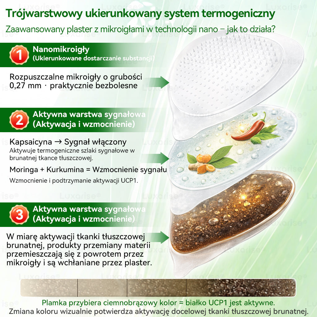 W badaniach klinicznych użytkownicy stosujący 𝐋𝐮𝐱𝐚𝐫𝐢𝐬𝐞®𝐌𝐨𝐫𝐢𝐧𝐠𝐚 𝐳 𝐛𝐞𝐫𝐛𝐞𝐫𝐲𝐧ą 𝟏𝟎 𝐖 𝟏 𝐙𝐚𝐚𝐰𝐚𝐧𝐬𝐨𝐰𝐚𝐧𝐲 𝐍𝐚𝐧𝐨-𝐌𝐢𝐤𝐫𝐨𝐢𝐠ł𝐨𝐰𝐲 𝐏𝐥𝐚𝐬𝐭𝐞𝐫 osiągnął przełomowe rezultaty – niektórzy zrzucili 3-3,6 kg uporczywego tłuszczu w zaledwie tydzień. Jeden plaster dziennie działa na najbardziej oporny tłuszcz trzewny i brzuszny, pobudzając i usuwając aktywowane metabolity brunatnej tkanki tłuszczowej (z widoczną, intensywnie brązową zmianą koloru bezpośrednio na plastrze), rzeźbiąc szczuplejszą sylwetkę bez wyczerpujących treningów o wysokiej intensywności. To nie tylko utrata wagi – to precyzyjna aktywacja i usuwanie brunatnej tkanki tłuszczowej, która zmienia kształt ciała od wewnątrz. Dane mówią same za siebie: prawdziwi użytkownicy, prawdziwe rezultaty, bez konieczności drastycznych diet.