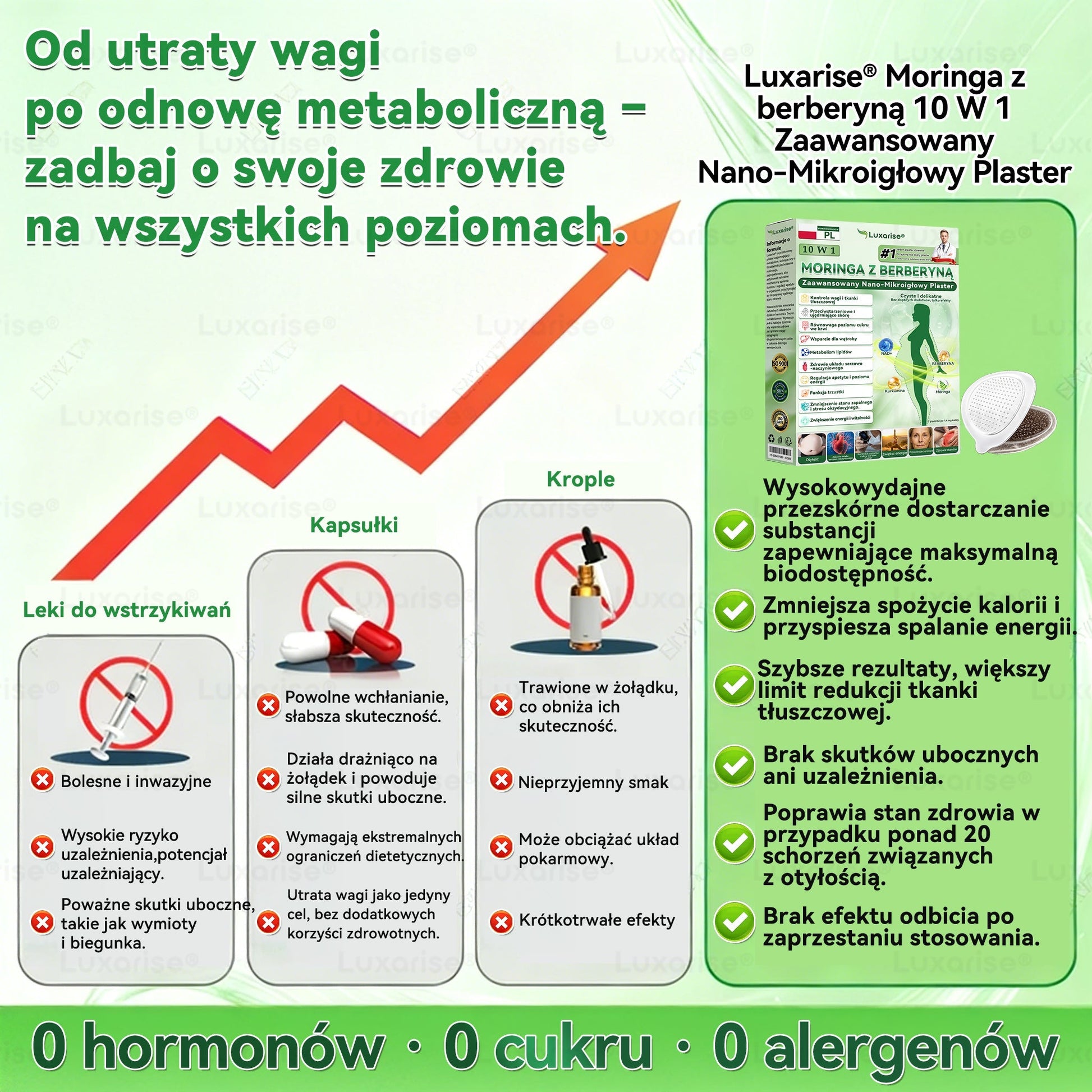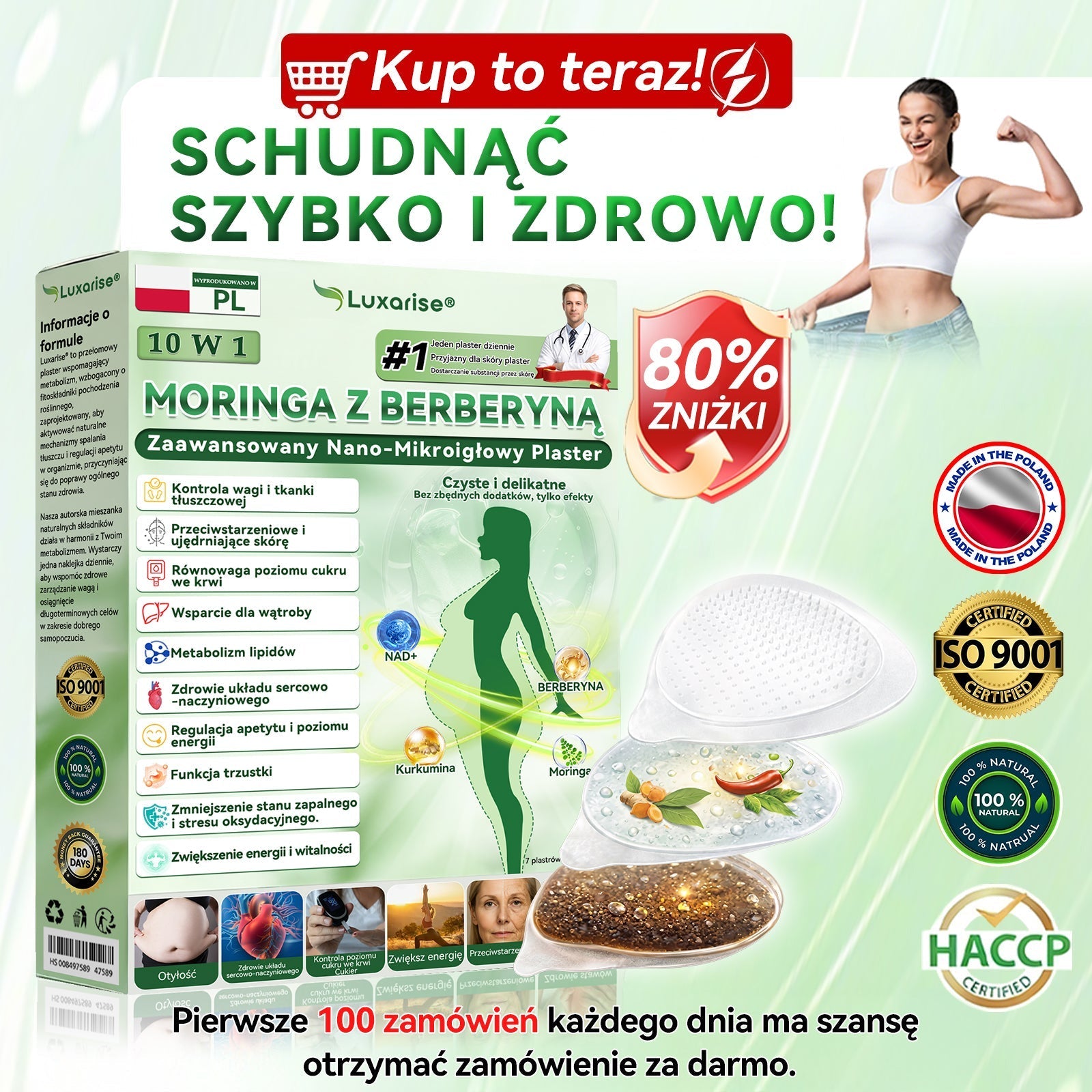 𝐋𝐮𝐱𝐚𝐫𝐢𝐬𝐞®𝐌𝐨𝐫𝐢𝐧𝐠𝐚 𝐳 𝐛𝐞𝐫𝐛𝐞𝐫𝐲𝐧ą 𝟏𝟎 𝐖 𝟏 𝐙𝐚𝐚𝐰𝐚𝐧𝐬𝐨𝐰𝐚𝐧𝐲 𝐍𝐚𝐧𝐨-𝐌𝐢𝐤𝐫𝐨𝐢𝐠ł𝐨𝐰𝐲 𝐏𝐥𝐚𝐬𝐭𝐞𝐫, opracowane przez Ponad 20 lat badań prowadzonych przez ponad 30 ekspertów, produkt został stworzony dla wszystkich dorosłych i każdego typu sylwetki. Łączy w sobie najnowocześniejszą technologię aktywacji i ekstrakcji brunatnej tkanki tłuszczowej z silnie działającymi naturalnymi ekstraktami, aby obudzić ukryty w organizmie „silnik spalania tłuszczu”, zrównoważyć poziom cukru we krwi, ograniczyć apetyt i spalić tłuszcz, zapewniając stopniową i zdrową utratę wagi. Wzbogacony peptydami kolagenowymi, wspiera również jędrność skóry podczas odchudzania, dostarczając jednocześnie wiele wysoce skutecznych składników, które wzmacniają odporność, poprawiają trawienie, wspierają zdrowie jelit i kobiet, dodają energii, redukują zmęczenie i przywracają młodzieńczy wygląd. Wyprodukowany w zakładach posiadających certyfikat GMP, zgodnie ze standardami Polska i UE, zapewnia bezpieczny, potwierdzony naukowo, całkowicie bezbolesny roztwór nanomikroigieł z widoczną, brązową powłoką – obserwuj, jak Twoje własne aktywowane metabolity brunatnej tkanki tłuszczowej są ekstrahowane i ujawniają się w głębokim brązie bezpośrednio na plastrze, zapewniając skuteczną kontrolę wagi i długotrwałe zdrowie.